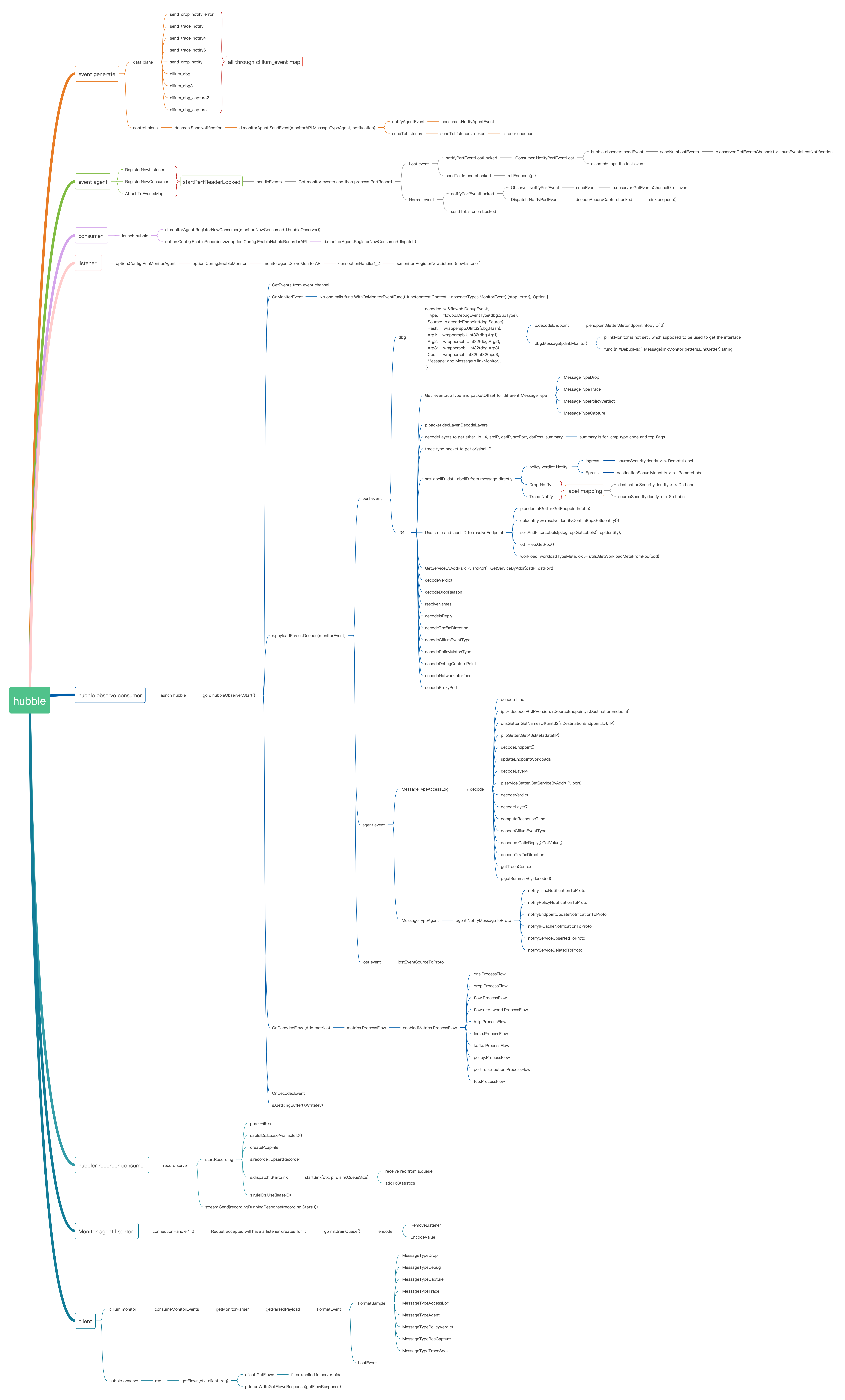 hubble agent register listener and consumer of the events, and the start a go routine to handle the events It only handles the events from data plane, Control plane events will be sent to listeners and consumers directly.