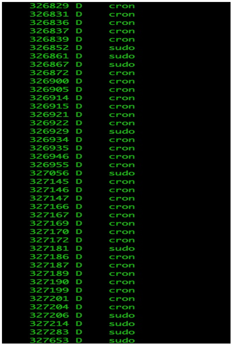 • There are lots of cron and sudo processes stuck in D status