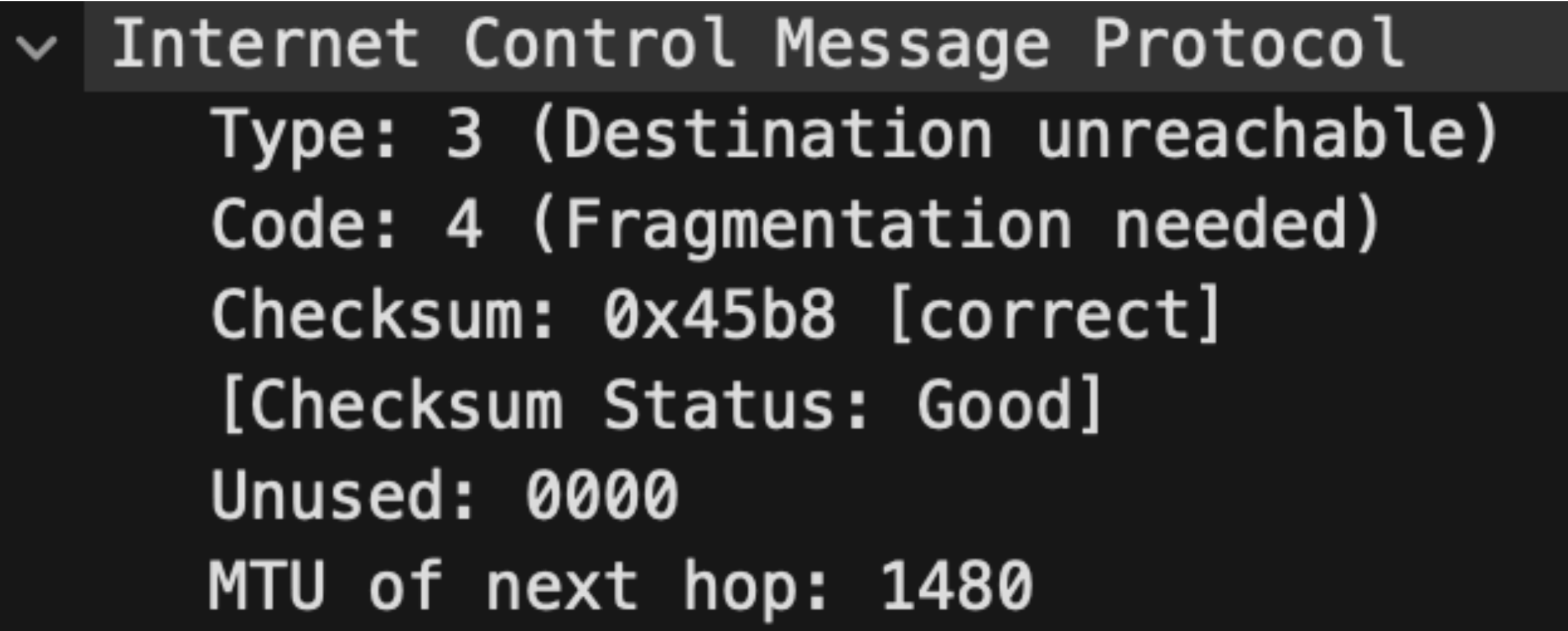 The details of this ICMP packet also include the MTU information, which is 1480..