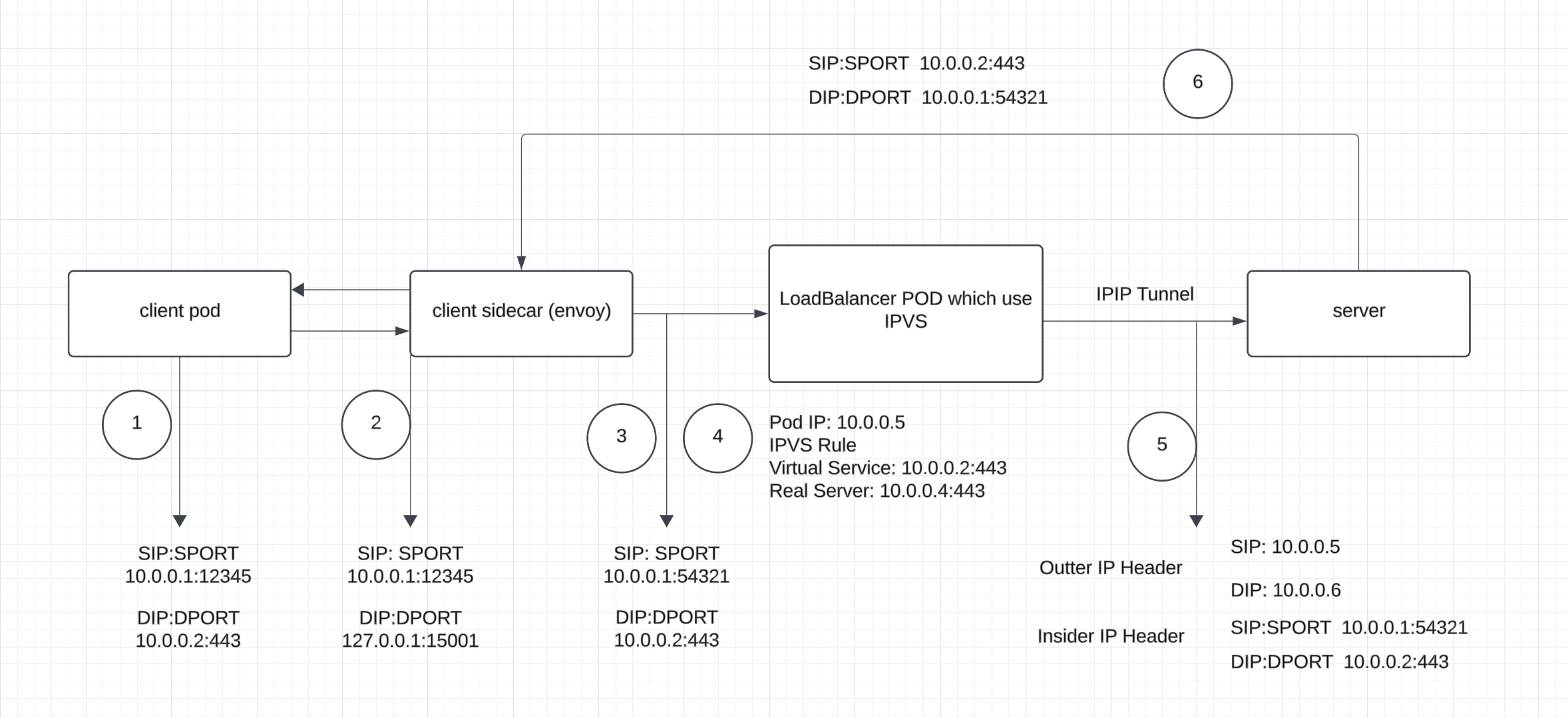 5. The TCP SYN packet from 10.0.0.1:54321 to 10.0.0.2:443 is forwarded to a real server with an IPIP tunnel header, where the outer IP header has the source IP 10.0.0.5 (load balancer’s IP) and the destination IP 10.0.0.6 (real server’s IP), while the inner IP/TCP header remains unchanged..