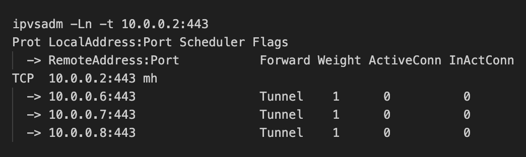 4. The load balancer uses IPVS with the IPIP packet forwarding method and has the following IPVS rule: