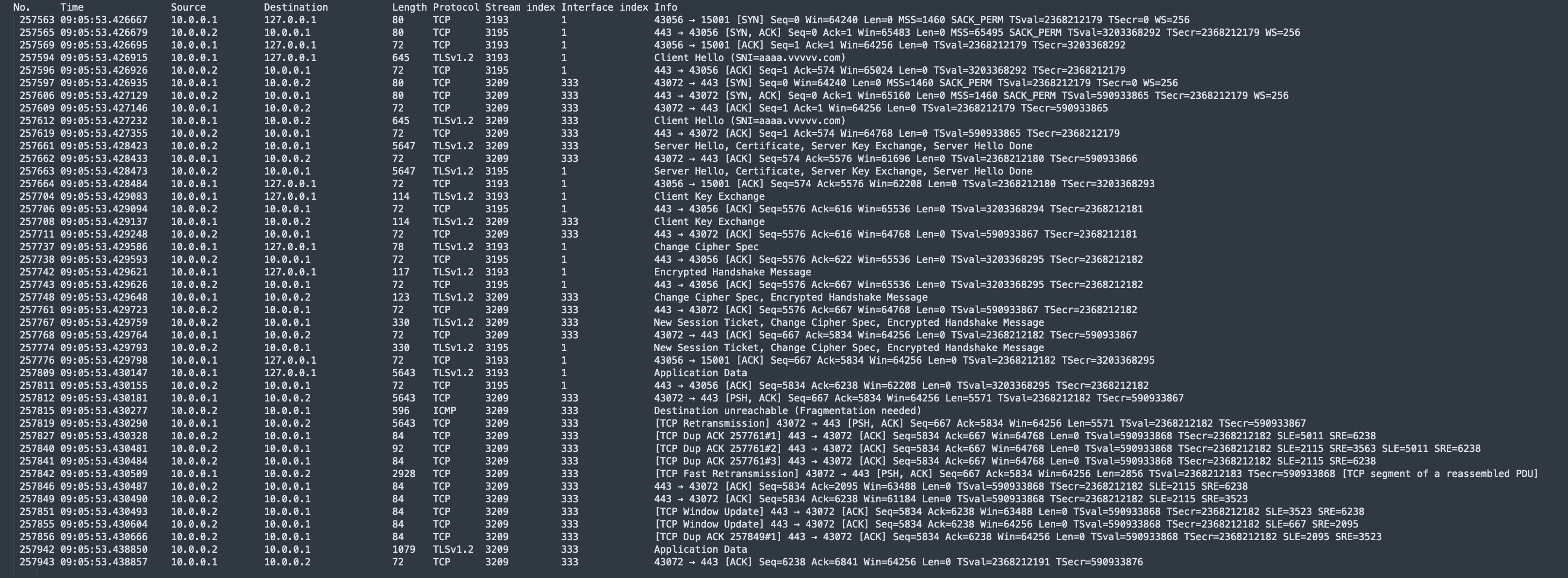 • Packet number 257819 is the retransmission of packet number 257812, with only a 0.1 ms time difference between 09:05:53.430290 and 09:05:53.430181.
