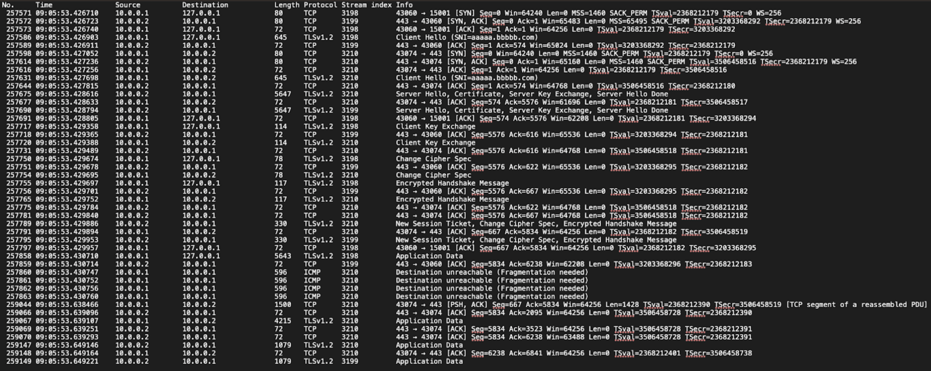 • Packet number 259044 is the first packet sent from 10.0.0.1 to 10.0.0.2. The timestamp is 09:05:53.638466, indicating a delay of approximately 207.76 ms compared to the timestamp 09:05:53.430710 of packet number 257858.